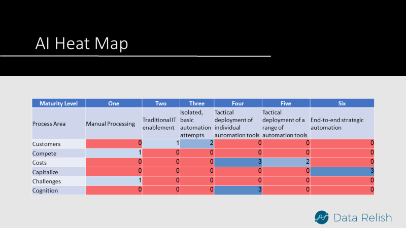 It can help to visualize where you are in your AI journey, and this gives you steps to improve upon. Here is a sample AI Heat Map using Power BI and Excel, so it gives you a sample: