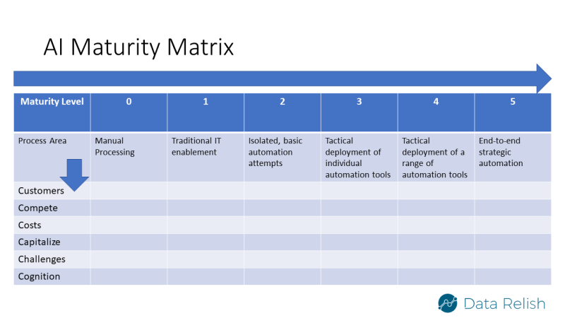Here is a sample AI Maturity Matrix to help you on your way. Based on the 8 ‘C’s mentioned previously, you can start to map our your maturity matrix in AI. Then, you can dial down to the detail of how you are going to get there.